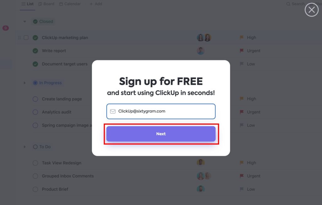1. สมัครใช้งาน ClickUp ฟรี เข้าไปที่ เว็บไซต์ ClickUp ซึ่งไม่ต้องดาวน์โหลดเนื่องจาก โดยทั่วไปแล้วระบบทุกอย่างของคลิกอัพทำงานผ่านเว็บเบราว์เซอร์ แต่อย่างไรก็ดี หากคุณต้องการดาวน์โหลดแอป ClickUp ก็สามารถดาวน์โหลดได้ที่นี่